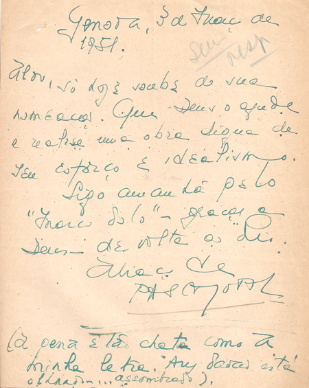 Gênova, 3 de março de 1951.Aldo, só hoje recebo a sua nomeação. Que Deus o ajude e realize uma obra digna de seu esforço e idealismo. Sigo amanhã pelo “Marco Polo” – graças a Deus – de volta ao Rio.