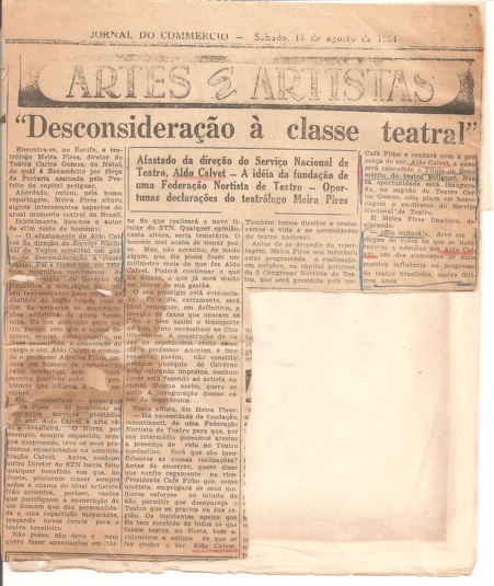 Há necessidade – prossegue Meira Pires – de proclamar os relevantes serviços prestados pelo sr. Aldo Calvet à arte cênica brasileira. O Norte, por exemplo, sempre esquecido, sempre desprezado, teve os seus problemas equacionados na administração Calvet. Antes, nenhum outro Diretor do SNT havia feito qualquer benefício aos que, no Norte, procuram trazer sempre acesa a chama do ideal artístico. Não encontro, por isso, razões que justifiquem a exoneração de um homem que deu personalidade a uma repartição inoperante, traçando novos rumos para o teatro brasileiro.