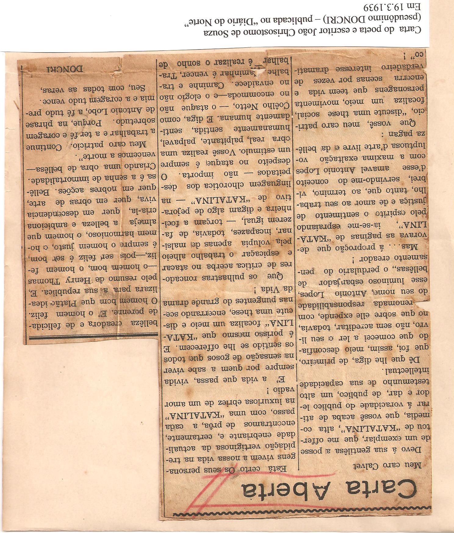 Devo a sua gentilesa a posse de um exemplar, que me offertou de “KATALINA”, alta comedia, que vosse acaba de atirar a voracidade do publico ledor e dar, de publico, um alto testemunho de sua capacidade intellectual.
