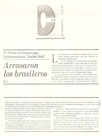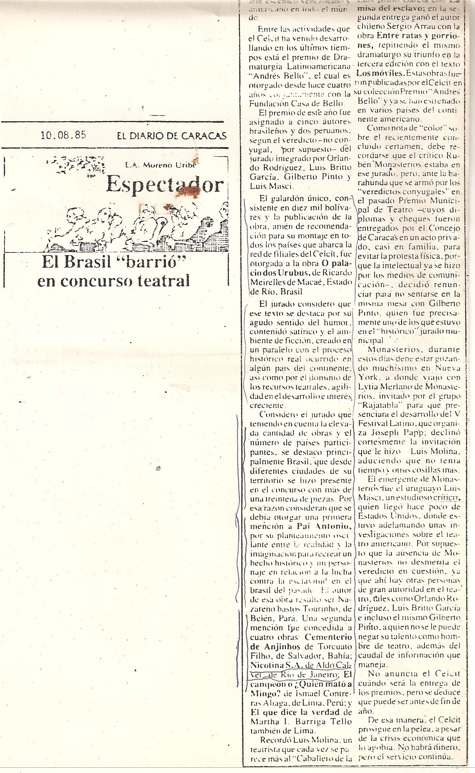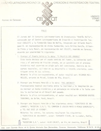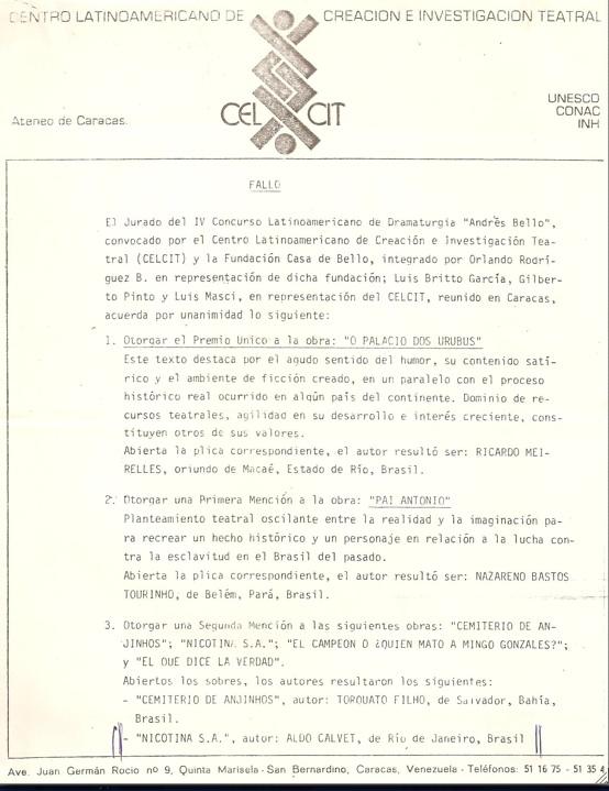 com menção Honrosa no Concurso de Peças do Centro Latino Americano de Creación e Investigación Teatral – CELCIT – Venezuela – 1985-