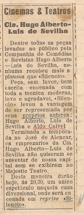 Peça, sem favor, bem escrita, encenada com toda a técnica moderna, leve e agradável, “Silêncio” levou a vantagem de ser representada por seus próprios autores: Hugo Alberto, Luis de Sevilha e Aldo Calvet.