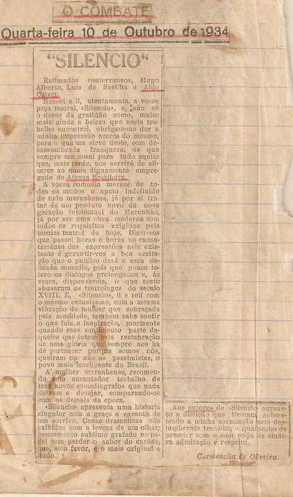 A vossa comédia merece de todos os modos o apoio indefinido de todo maranhense, já por se tratar de um produto novo da nova geração intellectual do Maranhão, já por ser uma obra moderna com todos os requisitos exigidos pela técnica teatral de hoje. Dizer-vos que passei horas e horas no encantamento das expressões nela existentes e garantir-vos a boa aceitação que o público dará a essa delicada comédia, pois que pouco tolero os diálogos prolongados e, às vezes, dispensáveis, o que tanto abusaram os teatrólogos do século XVIII. E, “Silêncio”, li e reli com o mesmo entusiasmo, com a mesma vibração de mulher que sobraçada pela mocidade, também sabe sentir o que fala a inspiração, mormente quando esse sentimento parte daqueles que lutam pela restauração de uma glória que sempre nos ha de pertencer porque somos nós, queiram ou não os pessimistas, o povo mais inteligente do Brasil.