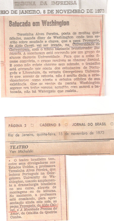 Teresinha Alves Pereira, poeta de muitas qualidades, manda dizer de Washington onde tem escrito sobre saudade e chuva, que a peça “Trompete”, de Aldo Calvet, vai ser levada, na Universidade de Georgetown, com o título bastante abrasileirado: Batucada. A montagem está correndo por um grupo de alunos daquela Universidade. Para que a coisa ficasse completa, o grupo resolveu se chamar Saravá. E como não existe charme sem adendo, o trabalho está correndo por conta dos estudantes de Português e Literatura, da vetusta Georgetown University que, apesar de vetusta, não é muito dada a arterioesclerose como atesta a crônica pública de sua existência. Que os ventos da pacata Washington soprem pra todos porque, acredito, com saravá e batucada, não há Watergate que resista.