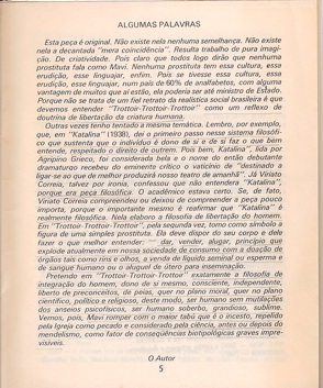 Esta peça é original. Não existe nela nenhuma semelhança. Não existe nela a decantada “mera coincidência”. Resulta trabalho de pura imaginação. De criatividade. Pois, claro, que todos logo dirão que nenhuma prostituta fala como MAVI. Nenhuma prostituta tem essa cultura, essa erudição, esse linguajar, enfim. Pois se tivesse essa cultura, essa erudição, esse linguajar, num pais de 60% de analfabetos, com alguma vantagem de muitos que aí estão, ela poderia ate ocupar o cargo de Ministro de Estado. Porque não se trata de fiel retrato da realística social brasileira é que devemos entender “Trottoir…Trottoir…Trottoir…” como um reflexo da doutrina de libertação da criatura humana.